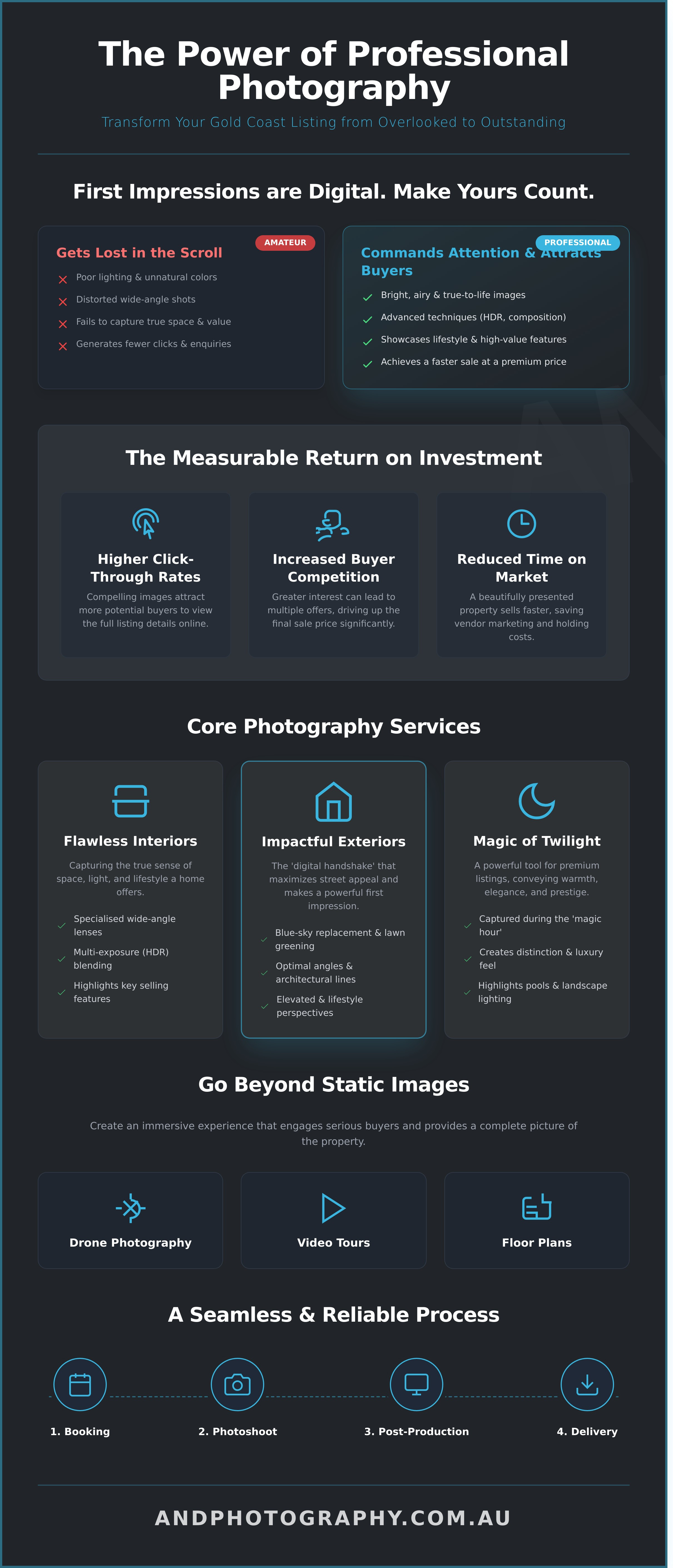 In the fast-paced Gold Coast real estate market, efficiency and reliability are non-negotiable. We understand that agents need a seamless process that delivers exceptional results without adding to their workload. At AND Photography, we have refined our workflow to be simple, stress-free, and completely transparent from start to finish. We don’t just take photos; we act as a dedicated extension of your team, partnering with you to ensure every listing is presented perfectly. Your success is our success.